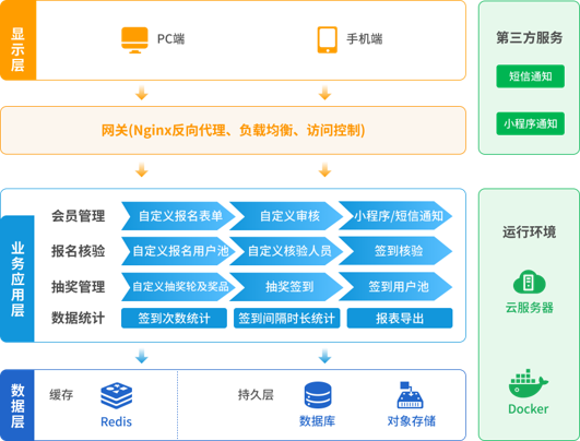 会议报名系统是专为会议组织者打造的数字化管理工具,支持会议创建、自定义报名表单、审核、核验、数据实时统计、用户池安全管控等闭环管理。同时,为促进会议互动,还支持签到人员参与抽奖的功能。